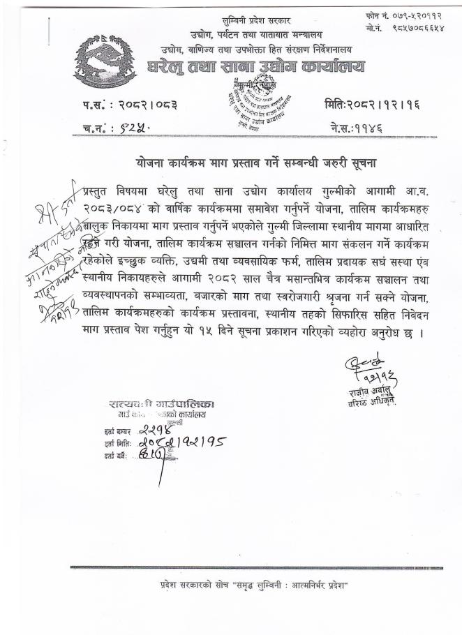 योजना कार्यक्रम माग प्रस्ताव गर्ने सम्बन्धी घरेलु तथा साना उद्योग कार्यालय, गुल्मीको सूचना ।