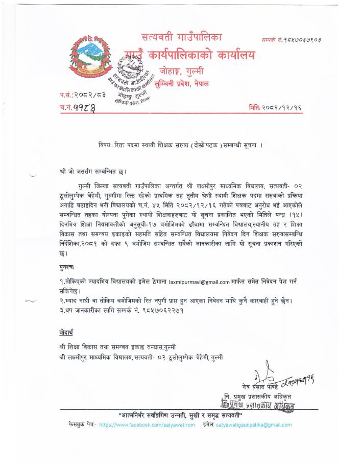श्री जो जससँग सम्बन्धित छ । रिक्त पदमा स्थायी शिक्षक सरुवा (दोश्रो पटक) सम्बन्धी सूचना ।