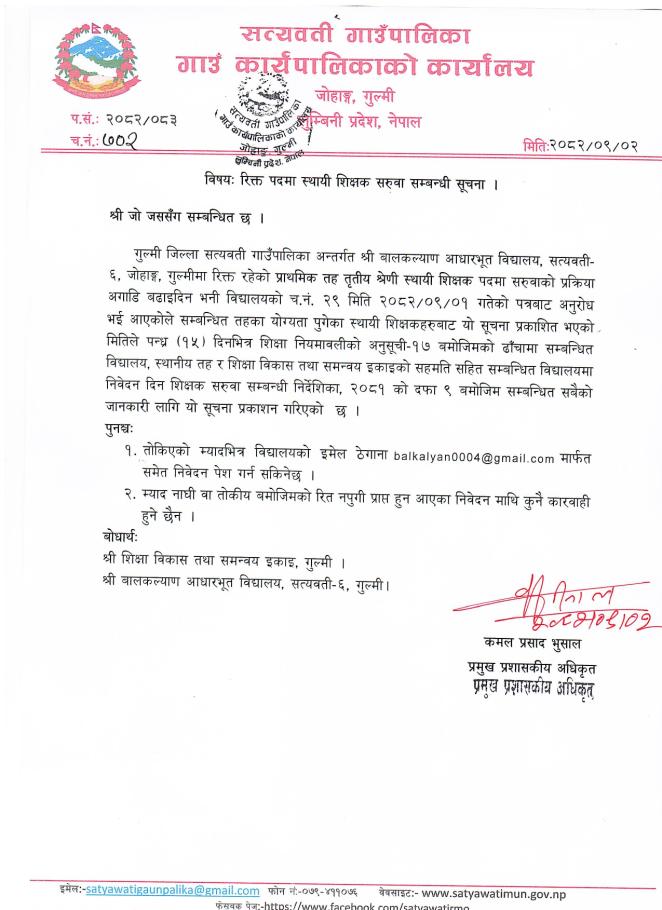 श्री जो जस सँग सम्बन्धित छ । रिक्त पदमा स्थायी शिक्षक सरुवा सम्बन्धी सूचना ।