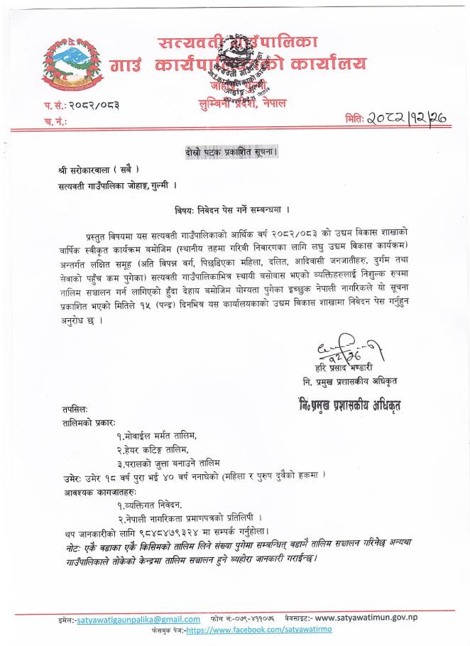 श्री सरोकारवाला (सबै), सत्यवती गाउँपालिका, जोहाङ्ग, गुल्मी । निवेदन पेस गर्ने सम्बन्धमा ।