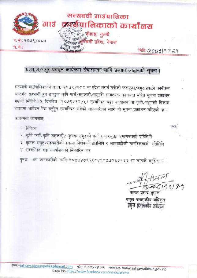 फलफूल/बंगुर प्रवर्द्धन कार्यक्रम संचालनका लागि प्रस्ताव आव्हानको सूचना ।