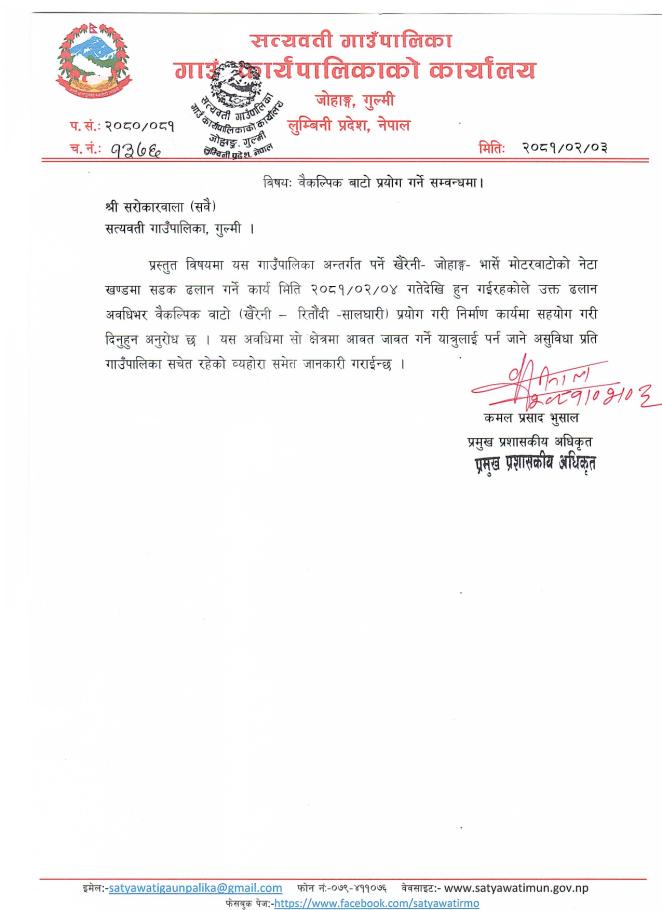 » श्री सरोकारवाला (सवै), सत्यवती गाउँपालिका, गुल्मी । वैकल्पिक बाटो प्रयोग गर्ने सम्बन्धमा ।