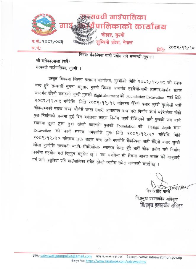 श्री सरोकारवाला (सवै), सत्यवती गाउँपालिका, गुल्मी । वैकल्पिक बाटो प्रयोग गर्ने सम्बन्धी सूचना ।