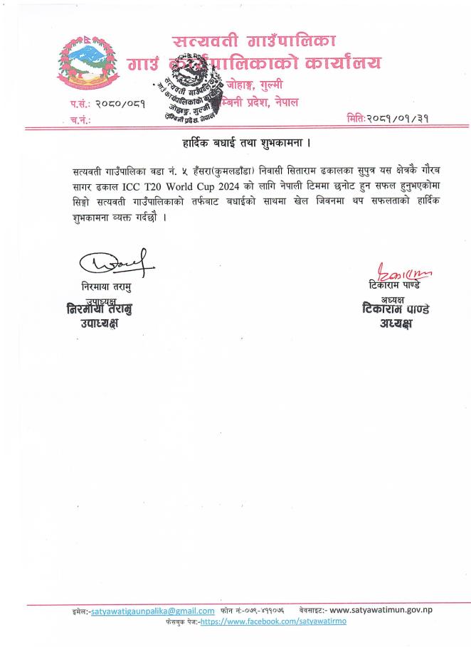 श्री सरोकारवाला सवै, सत्यवती गाउँपालिका, गुल्मी ।विषय: स्वास्थ्य बिमा कार्यक्रममा आबद्ध नागरिकको बिमालेख नवीकरण गर्ने सम्बन्धमा ।